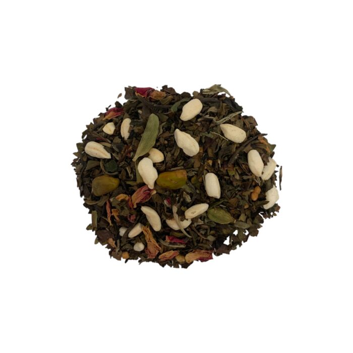Thé blanc façon riz au lait à la syrienne : Pistaches, pétales de rose, cardamome, riz soufflé et riz torréfié s’expriment pour dévoiler la subtilité d’un jeu de goût. A l’image de la cuisine syrienne, ce mélange invite à la convivialité.